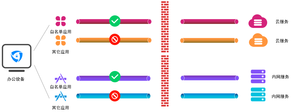 云涌零信任系統(tǒng)始終保證僅“合法”的本地應(yīng)用才能訪問(wèn)內(nèi)網(wǎng)服務(wù)。只有經(jīng)過(guò)管理員授權(quán)的應(yīng)用進(jìn)程才可以通過(guò)TLS隧道傳輸數(shù)據(jù)。系統(tǒng)將應(yīng)用與服務(wù)綁定,提高服務(wù)訪問(wèn)的安全性。
