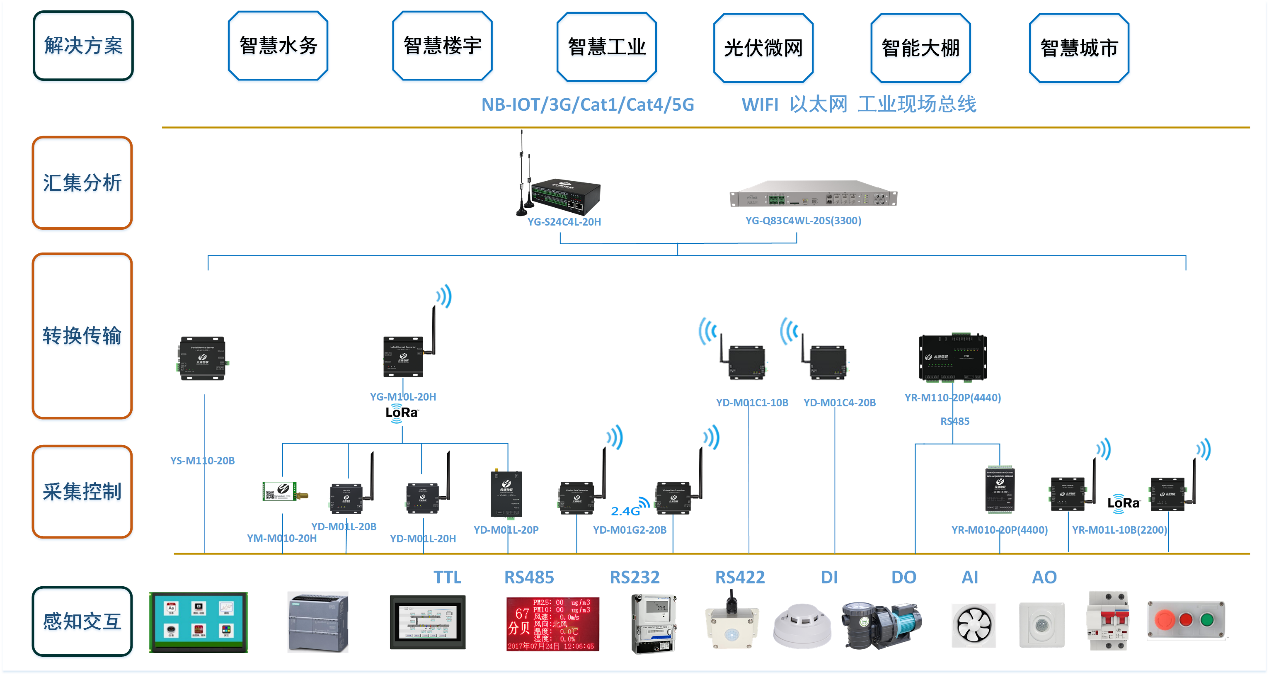 云涌科技智慧物聯(lián)網產品系列覆蓋采集控制、數據傳輸、數據分析等應用場景,同時支持以太網、RS485、RS232、RS422等現場總線,支持模擬量和數字量的輸入和輸出,也支持4G CAT1、4G CAT4、LoRa、WIFI等無線傳輸方式,能滿足現場復雜的通訊需求。