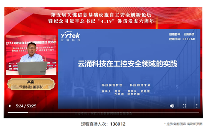 在大會(huì)企業(yè)線上專場(chǎng)環(huán)節(jié),云涌科技董事長(zhǎng)高南和研發(fā)總監(jiān)方艷湘,為大會(huì)帶來(lái)了《云涌科技在工控安全領(lǐng)域的實(shí)踐》的精彩演講.