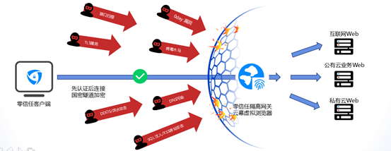 建立終端到遠(yuǎn)程隔離服務(wù)的國(guó)密加密隧道,隧道根據(jù)終端運(yùn)行環(huán)境和用戶身份安全評(píng)級(jí)實(shí)現(xiàn)隧道動(dòng)態(tài)建立和銷毀,始終保持最小訪問(wèn)授權(quán)。