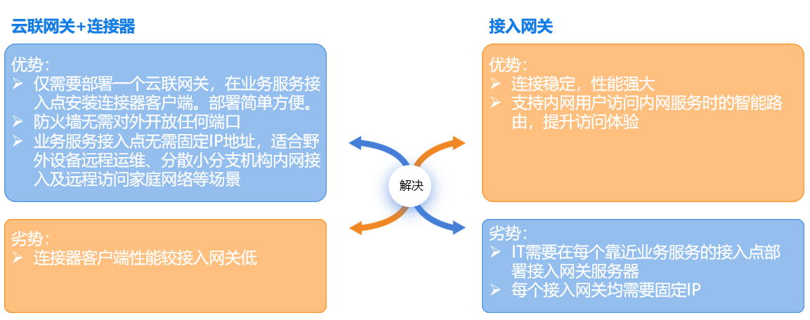 云涌遠(yuǎn)程辦公解決方案支持兩種內(nèi)網(wǎng)訪問模式:基于接入網(wǎng)關(guān)的訪問代理,以及基于云聯(lián)網(wǎng)關(guān)+連接器的內(nèi)網(wǎng)穿透??蛻艨梢愿鶕?jù)自身IT架構(gòu)及實(shí)際需求選擇適合的服務(wù)訪問模式。兩種模式可以同時(shí)存在。