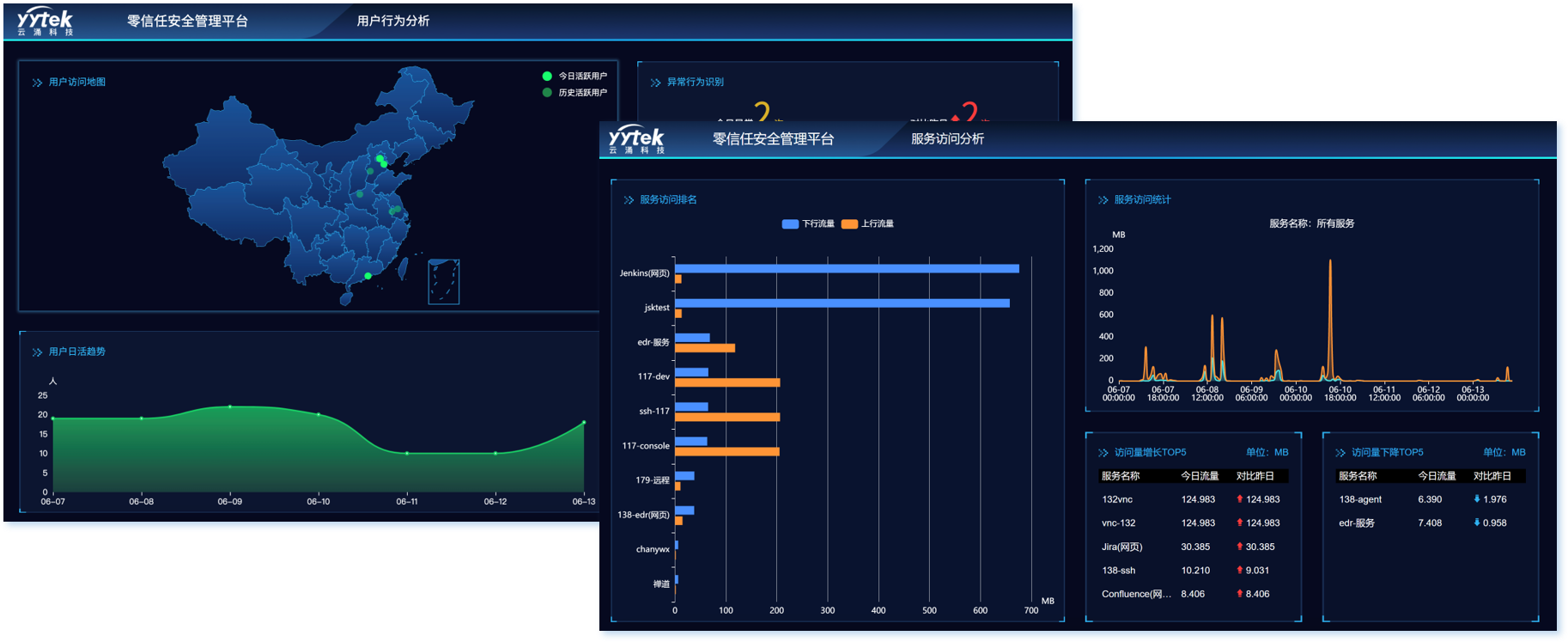 方案提供了用戶使用行為的態(tài)勢(shì)分析以及服務(wù)訪問態(tài)勢(shì)分析,通過態(tài)勢(shì)大屏展示方便日常管理及領(lǐng)導(dǎo)審閱。