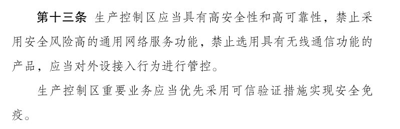 ? ? ? 第十三條明確提到:生產(chǎn)控制要業(yè)務(wù)應(yīng)當(dāng)優(yōu)先采用可信驗(yàn)證措施實(shí)現(xiàn)安全免疫,第十六條明確提到:電力監(jiān)控系統(tǒng)優(yōu)先選用安全可信的產(chǎn)品和服務(wù),電力監(jiān)控系統(tǒng)投運(yùn)前應(yīng)當(dāng)進(jìn)行安全加固,包括主機(jī)加固、系統(tǒng)加固等。