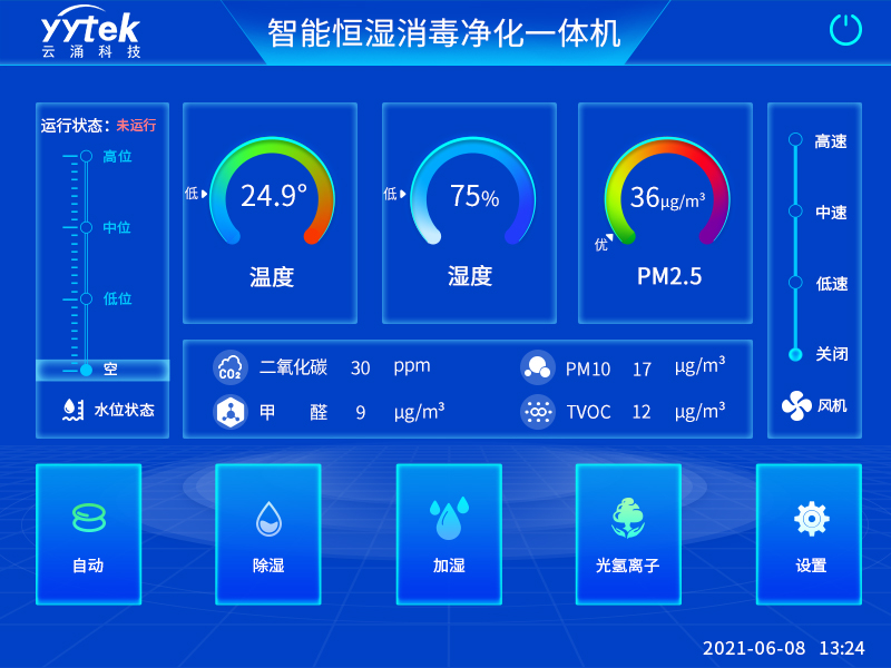 ? ? ? 此外,云涌智能恒濕消毒凈化一體機(jī)還具備智能化、人性化、直觀化的運(yùn)行方式及操作體驗(yàn),運(yùn)用微電腦智能控制技術(shù),全中文液晶觸控屏,功能模塊化設(shè)計(jì)等,搭配遠(yuǎn)程監(jiān)控系統(tǒng),實(shí)時(shí)智慧感知分析預(yù)制故障;同時(shí),設(shè)備自身配有大容量的內(nèi)置雙層水箱,實(shí)現(xiàn)雙重防漏保護(hù),結(jié)合配備的缺水、水滿(mǎn)、溢水漏水報(bào)警系統(tǒng),用戶(hù)可通過(guò)人工加水和自動(dòng)加水兩種可選方式,使整個(gè)設(shè)備在使用過(guò)程中更加安全便捷。
