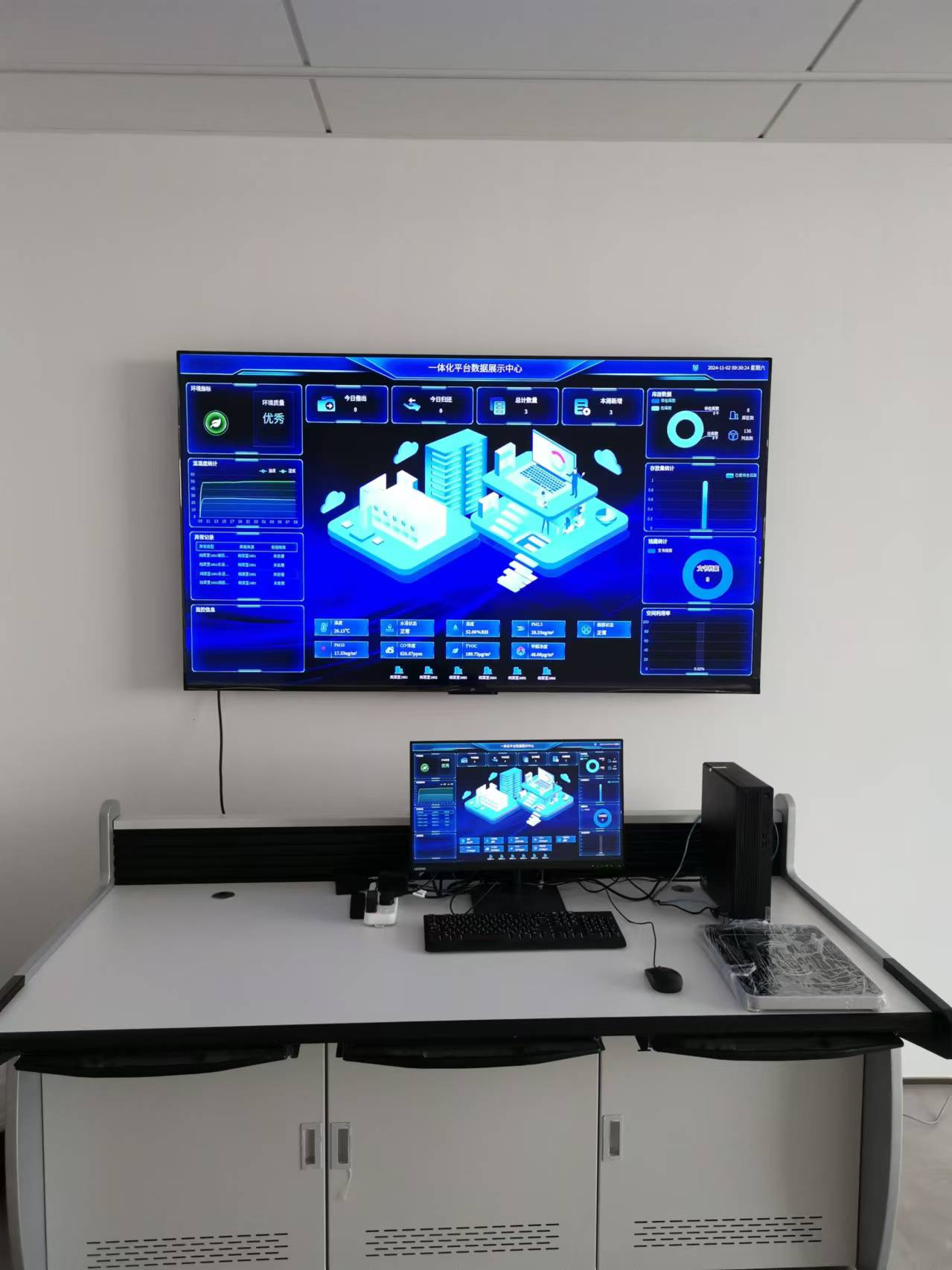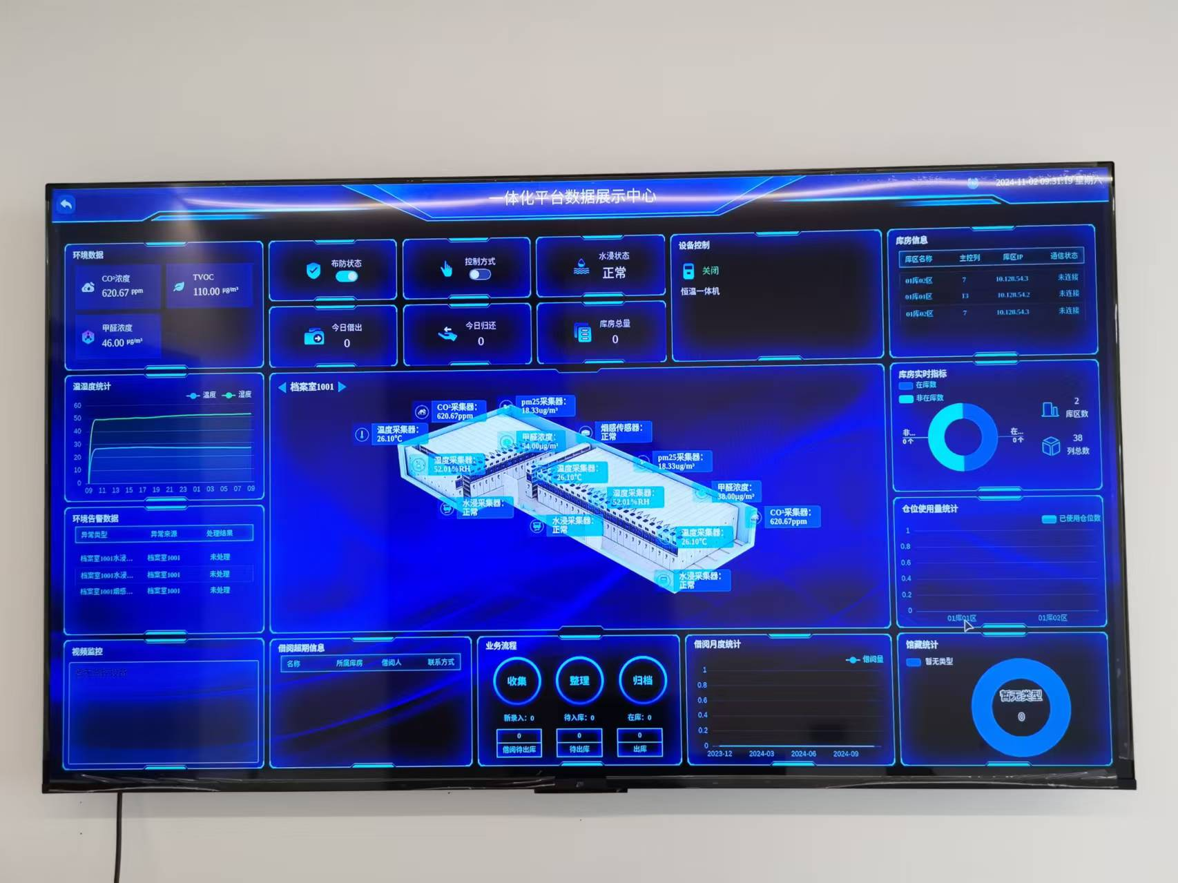 通過液晶顯示大屏來展示環(huán)境數(shù)據(jù)信息、檔案位置的引導信息、設備報警信息等。