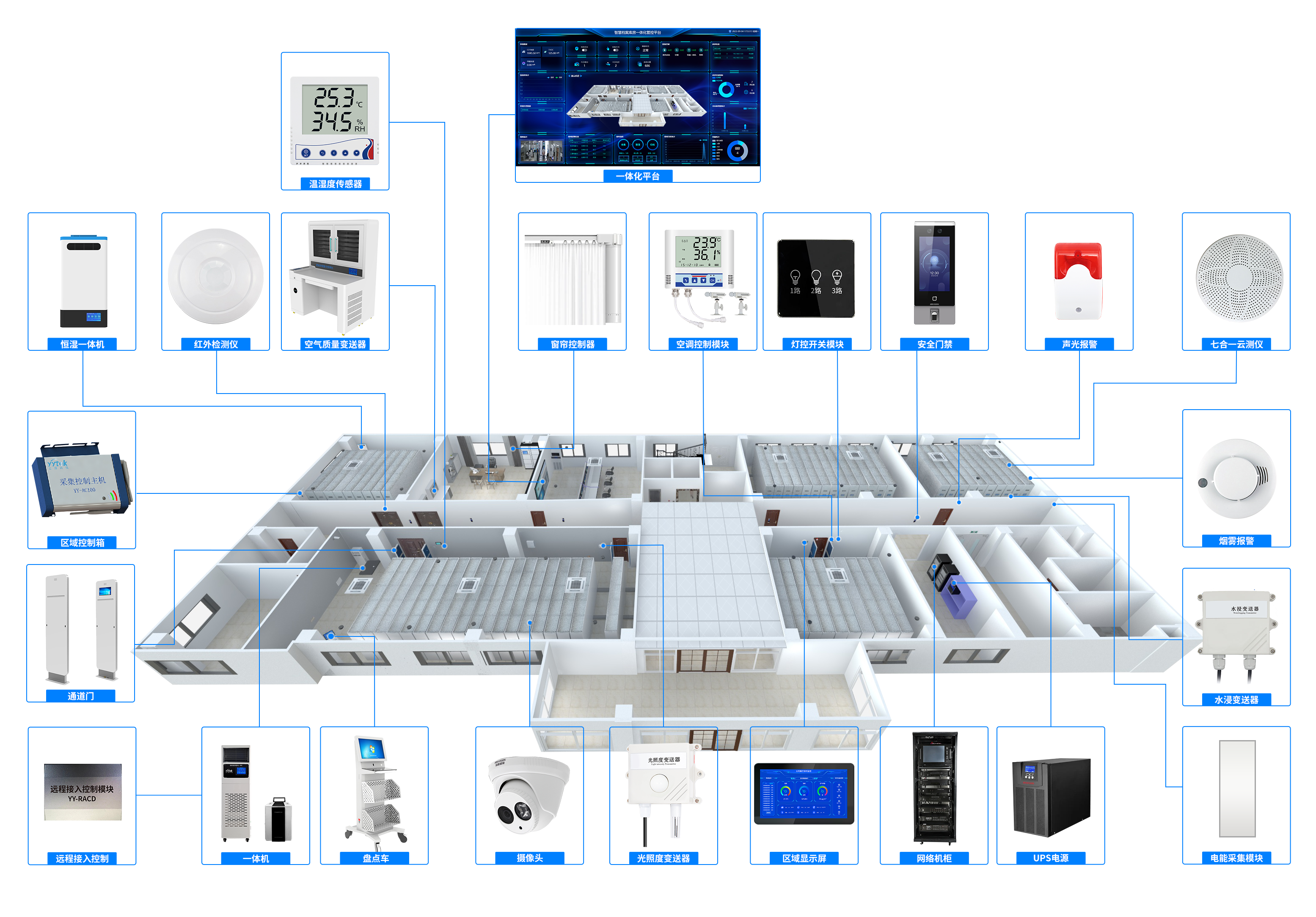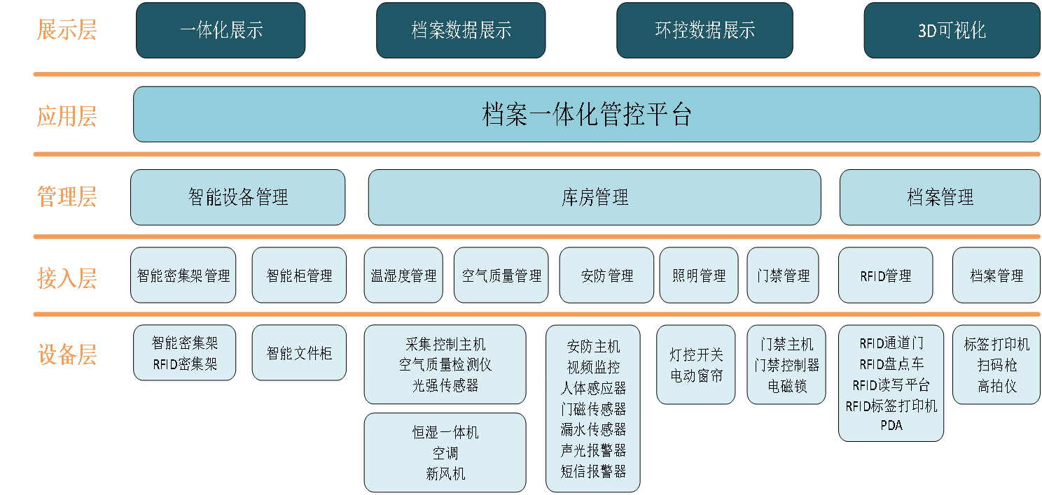 通過一套系統(tǒng)實現(xiàn)庫房內實體檔案管理設備、檔案存儲設備、檔案庫房環(huán)境監(jiān)控設備、檔案庫房安全防范設備等的統(tǒng)一管理。
