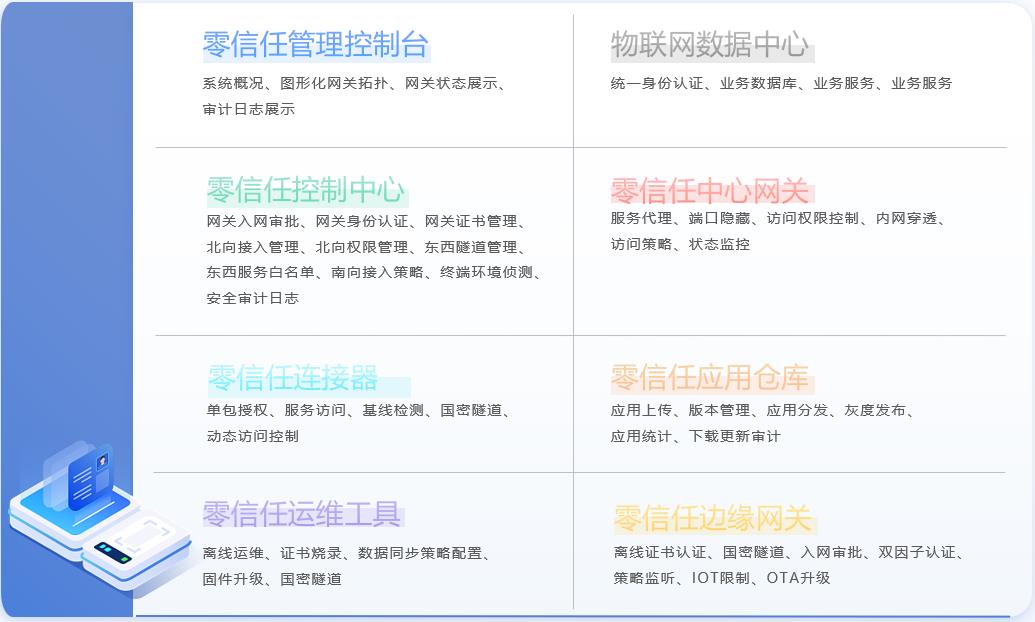 平臺(tái)由邊緣網(wǎng)關(guān)代理程序、網(wǎng)關(guān)離線運(yùn)維工具、控制中心、接入網(wǎng)關(guān)、應(yīng)用倉(cāng)庫(kù)等模塊組合而成。產(chǎn)品核心功能包括邊緣網(wǎng)關(guān)身份認(rèn)證、網(wǎng)關(guān)出入站訪問(wèn)控制、網(wǎng)關(guān)間微隔離控制、邊緣應(yīng)用管理、網(wǎng)關(guān)安全運(yùn)維、網(wǎng)關(guān)數(shù)據(jù)存儲(chǔ)透明加解密等。同時(shí)平臺(tái)保護(hù)網(wǎng)關(guān)與北向數(shù)據(jù)中心的訪問(wèn)安全,包括端口隱藏,通訊加密等。