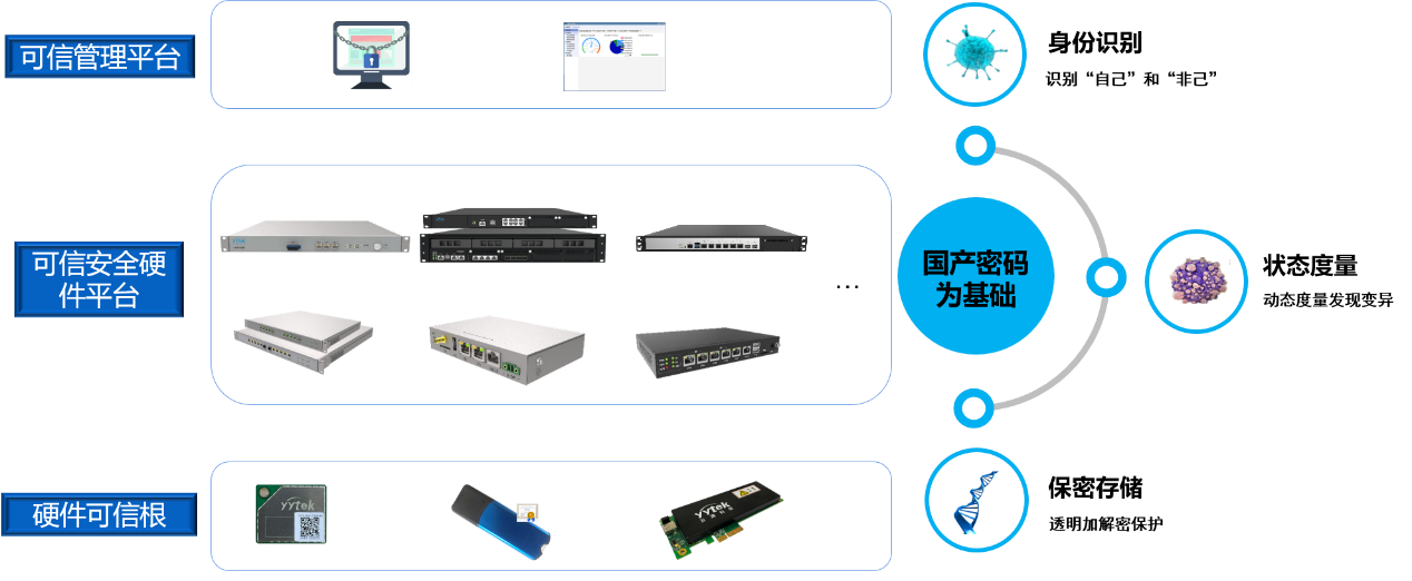 云涌可信計算平臺以可信計算為核心技術(shù),采用“計算+保護(hù)”雙體系結(jié)構(gòu),對通用計算部件(包括通用硬件和固件、操作系統(tǒng)、應(yīng)用軟件及服務(wù))進(jìn)行度量和控制,為現(xiàn)有系統(tǒng)構(gòu)建可信環(huán)境,實現(xiàn)自主防御,抵御未知木馬、病毒以及0day攻擊。此外,云涌還基于可信計算核心思想和基本架構(gòu),依據(jù)等級保護(hù)2.0要求,結(jié)合自身在工控安全領(lǐng)域多年來的軟硬件技術(shù)積累,打造出硬件可信根和可信安全硬件平臺等系列產(chǎn)品,全面守護(hù)底層到硬件層,乃至應(yīng)用層的系統(tǒng)安全。